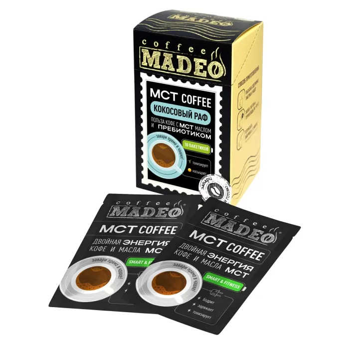 Десертный кофе Madeo МСТ Fitness Кокосовый раф — это порционный молотый кофе (10 стиков по 12 г) с добавлением натурального кокосового масла МСТ (MCT — триглицериды средней цепи). В основе лежит арабика из стран Латинской Америки, обжаренная до средней степени, что даёт сбалансированный вкус с нотами молока, миндаля и кокоса.