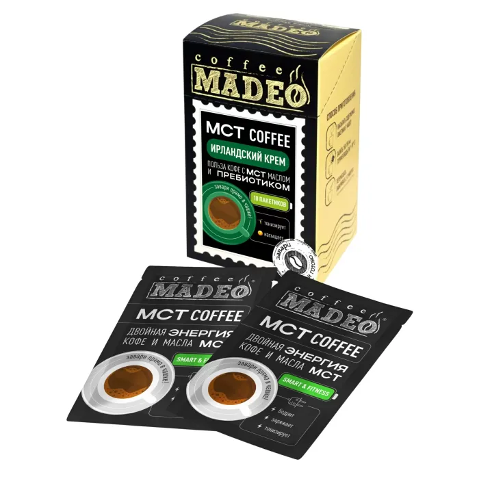 Десертный молотый кофе Madeo МСТ Fitness с ароматом ирландского крема. В основе — арабика из стран Латинской Америки средней обжарки с добавлением масла МСТ для придания сливочного вкуса. Профиль отличается низкой кислотностью, средней горечью и нотами молока, ликёра и кокоса.