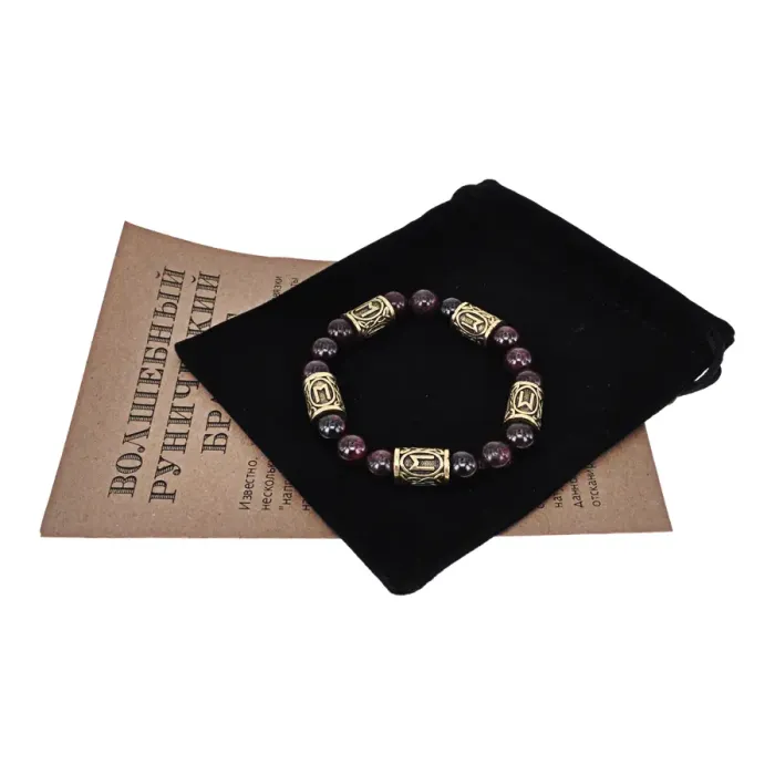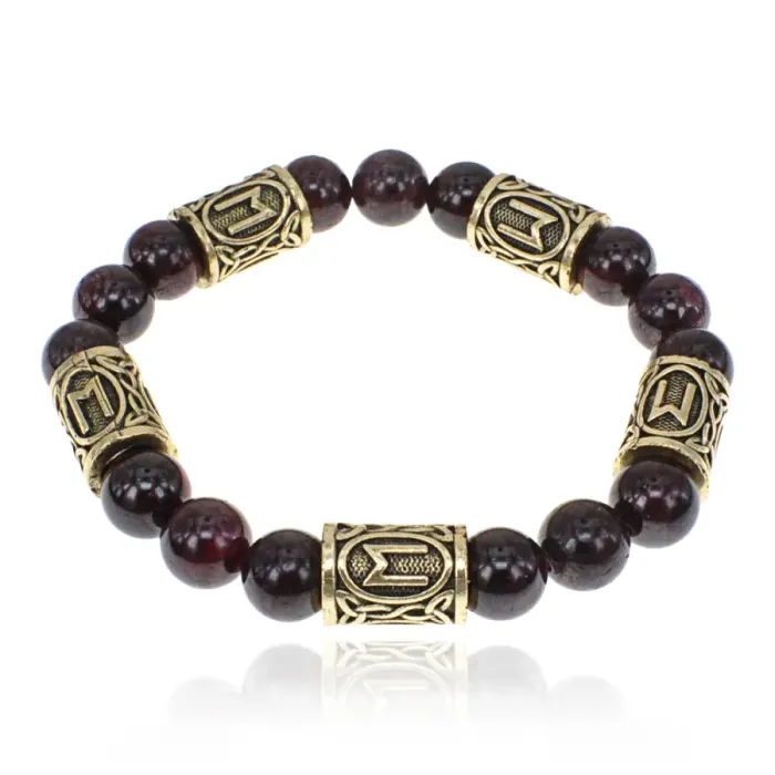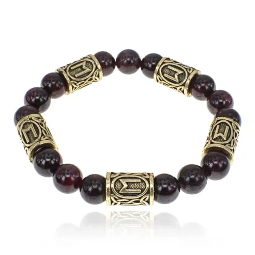 Браслет с рунами под золото Эваз, с нат. камнем Гранат 10мм BSR2-006