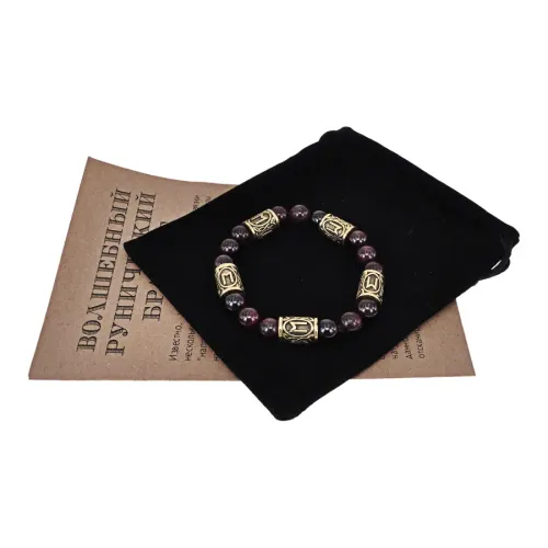 Рунический браслет-сувенир из натурального граната и бижутерного сплава с покрытием под золото, с символом руны Эваз.