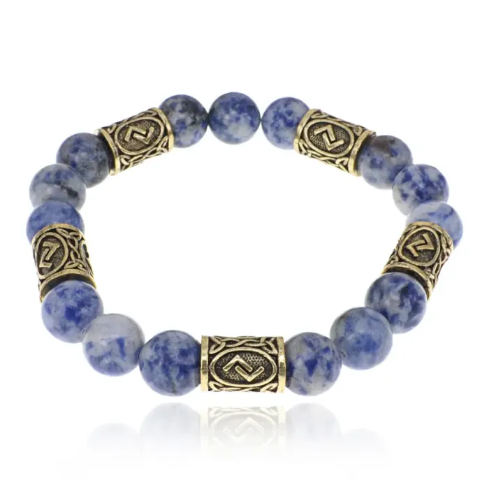 Браслет с рунами под золото Йера, с нат. камнем Содалит 10мм BSR2-007