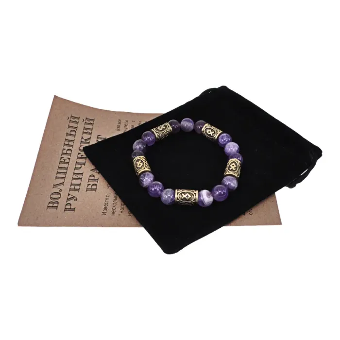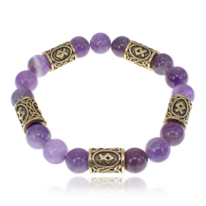 Браслет с рунами под золото Одал, с нат. камнем Аметист 10мм BSR2-012
