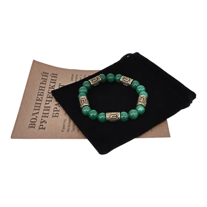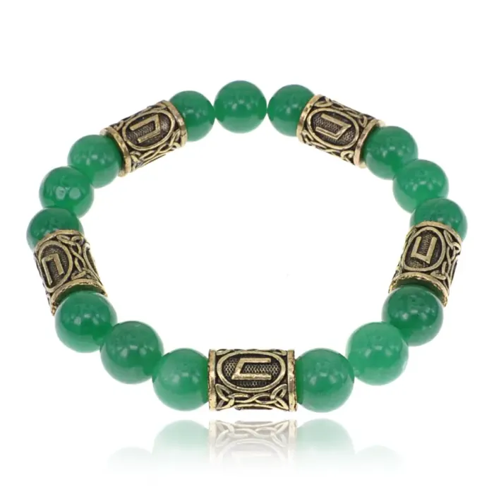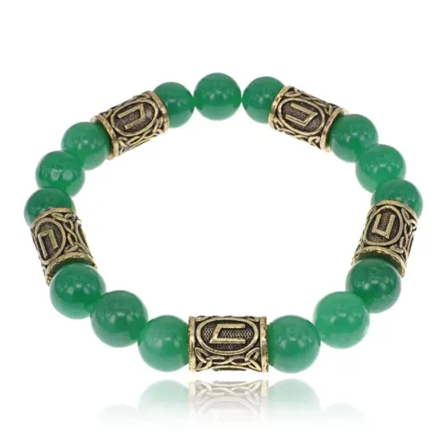 Браслет с рунами под золото Уруз, с нат. камнем Нефрит 10мм BSR2-013