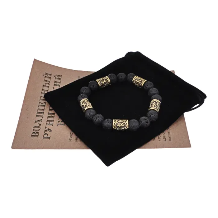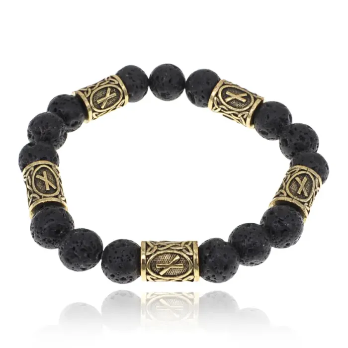 Браслет с рунами под золото Наутиз, с нат. камнем Лава 10мм BSR2-015