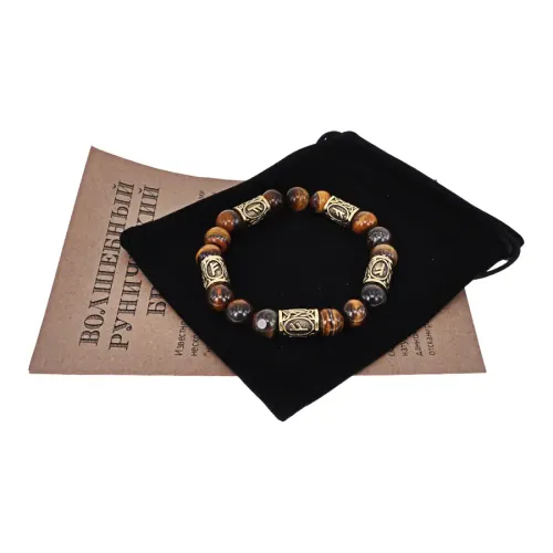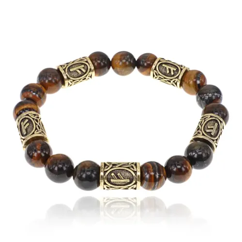Браслет с рунами под золото Феху, с нат. камнем Тигровый глаз 10мм BSR2-017