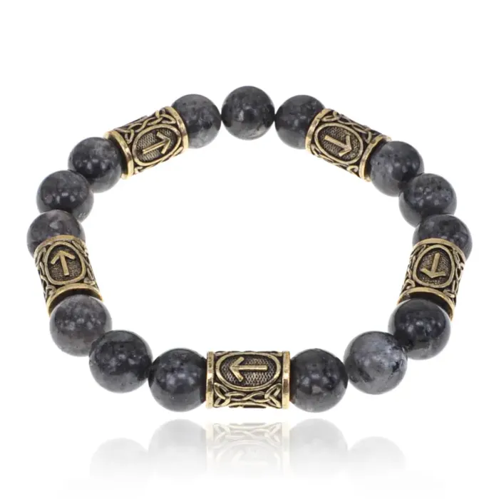 Браслет с рунами под золото Тейваз, с нат. камнем Лабрадор 10мм BSR2-020