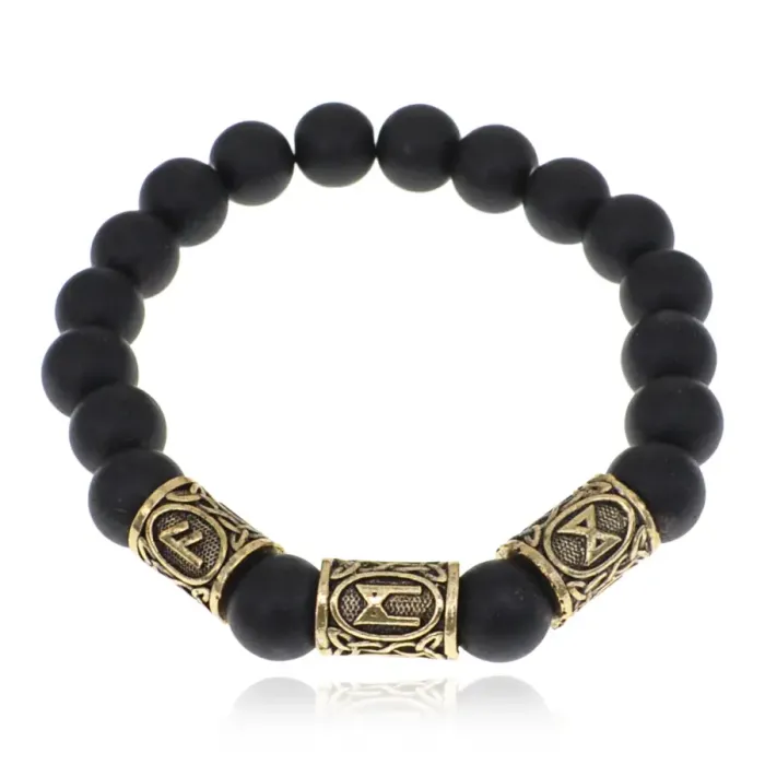 Браслет с рунами под золото Защита от сглаза порчи зла, с синт. камнем Шунгит 10мм BSR2-026