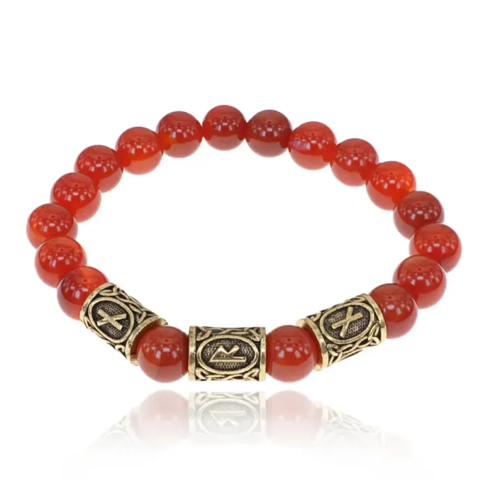 Мужской стрейч-браслет с руническим узором из натурального сердолика и металлических бусин с покрытием под золото.
