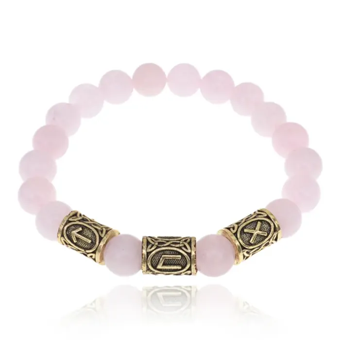 Браслет с рунами под золото Удача в любви, с нат. камнем Розовый кварц 10мм BSR2-033