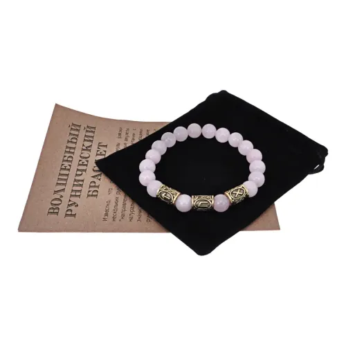 Браслет-сувенир с рунической формулой, выполненный из натурального розового кварца и бижутерного сплава с покрытием под золото.