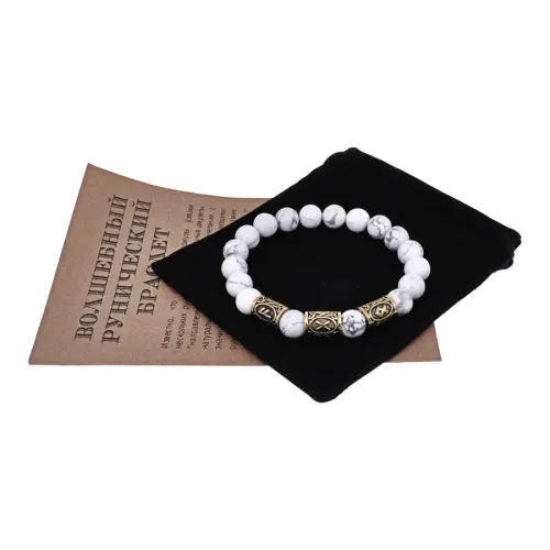 Браслет-сувенир из бижутерного сплава с покрытием под золото, с натуральным камнем кахолонг и символикой рун.