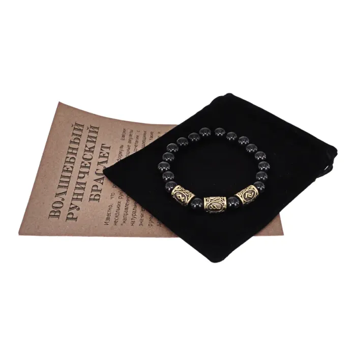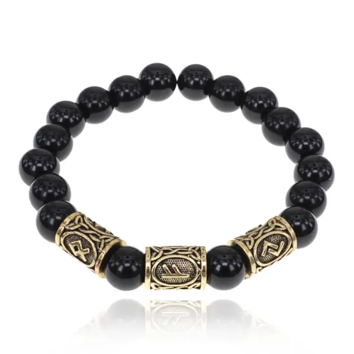 Браслет с рунами под золото Приумножение собственности, с нат. камнем Черный агат 10мм BSR2-040