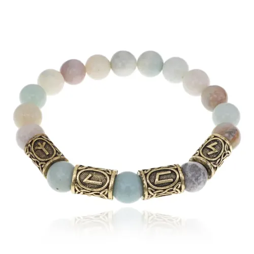 Мужской стрейч-браслет с рунами и натуральным камнем. Материал: бижутерный сплав с покрытием под золото и амазонит.