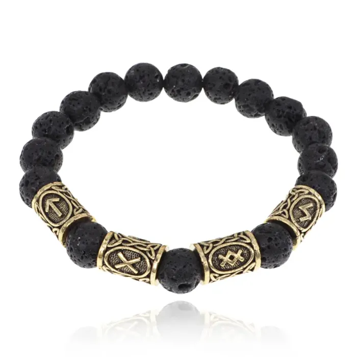Браслет с рунами под золото Мужская слава, с нат. камнем Лава 10мм BSR2-049
