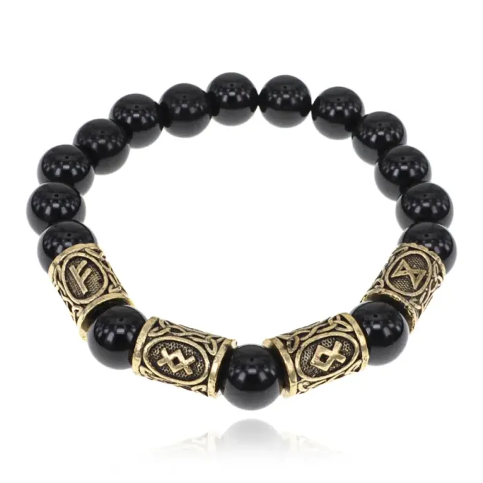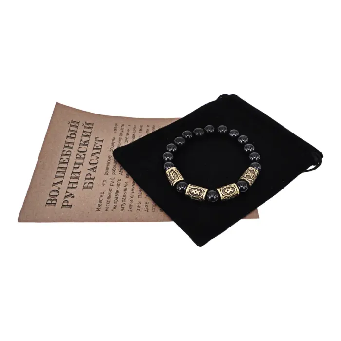Браслет с рунами под золото Растущее благосостояние, с нат. камнем Черный агат 10мм BSR2-054
