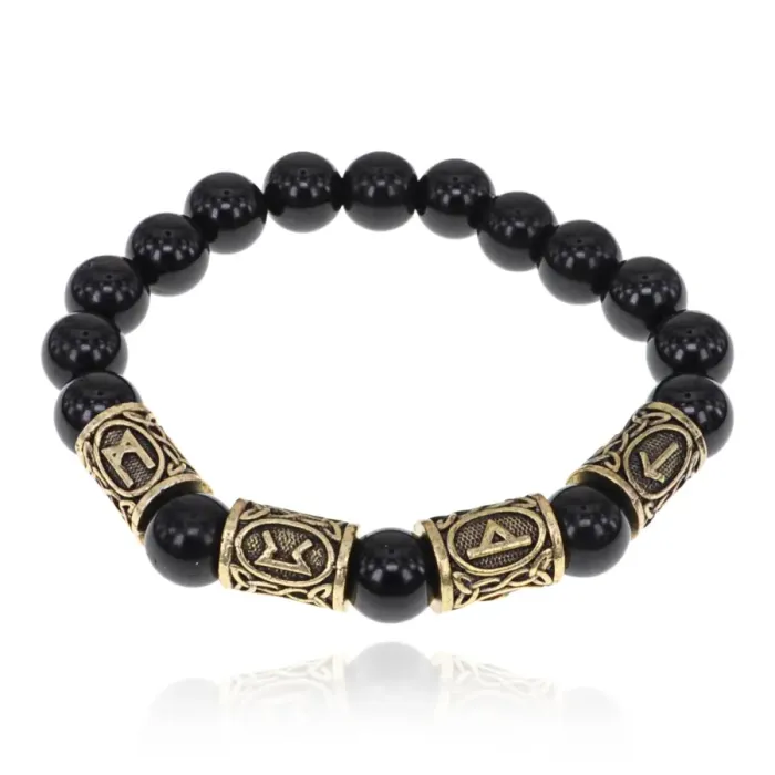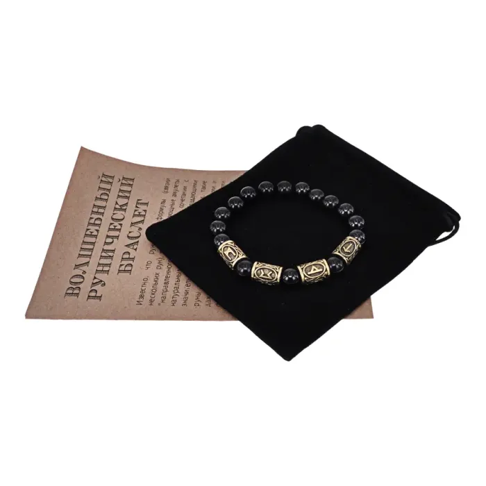 Браслет с рунами под золото Защита от энергетических вампиров, с нат. камнем Черный агат 10мм BSR2-069
