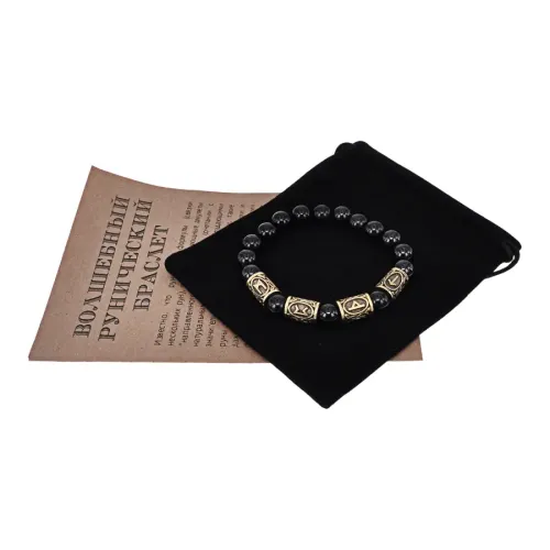 Материал и изготовление: Бижутерный сплав с покрытием под золото, натуральный чёрный агат. Бусины с нанесёнными рунами: Манназ, Перт, Турисаз, Тейваз.