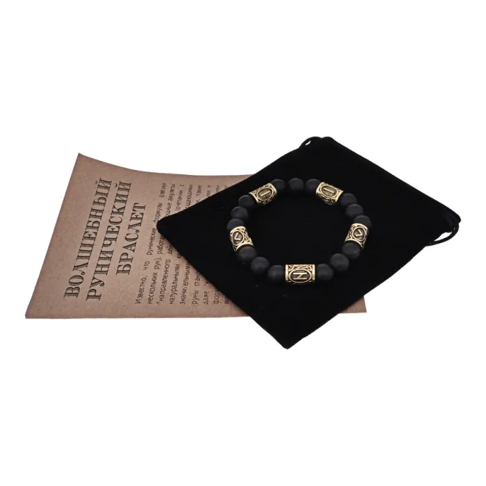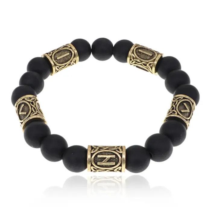 Браслет с рунами под золото Защитный щит Зеркало, с синт. камнем Шунгит 10мм BSR2-075