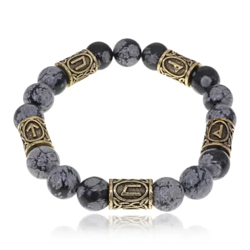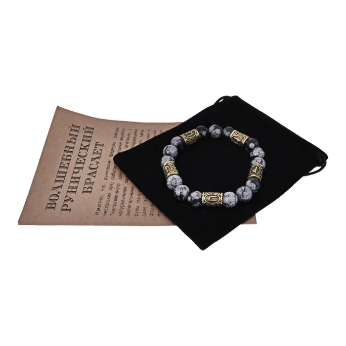 Браслет с рунами под золото Выход из депрессии, с нат. камнем Обсидиан 10мм BSR2-077