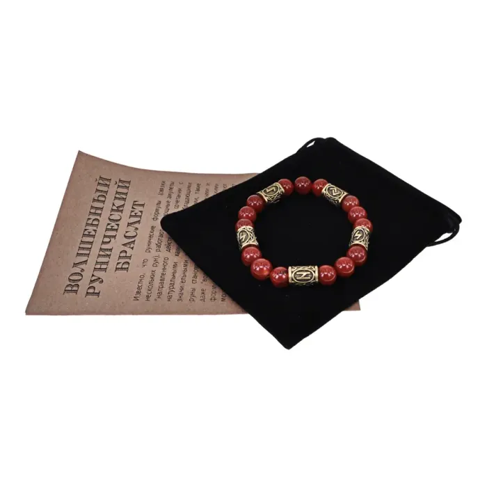 Браслет с рунами для сувенира или личного использования. Изготовлен из натурального сердолика и бижутерного сплава с покрытием под золото.