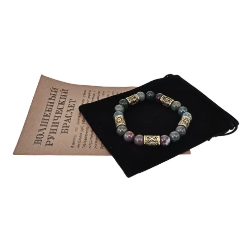 Браслет-амулет с рунами. Изготовлен из натуральной яшмы и бижутерного сплава с покрытием под золото. Конструкция стрейч.