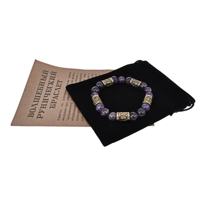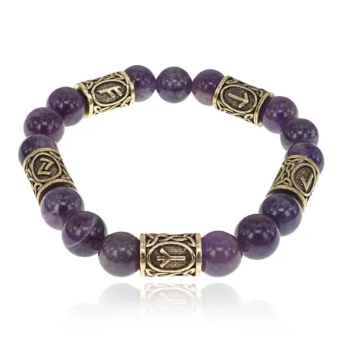 Браслет с рунами под золото Власть в трех мирах, с нат. камнем Аметист 10мм BSR2-086