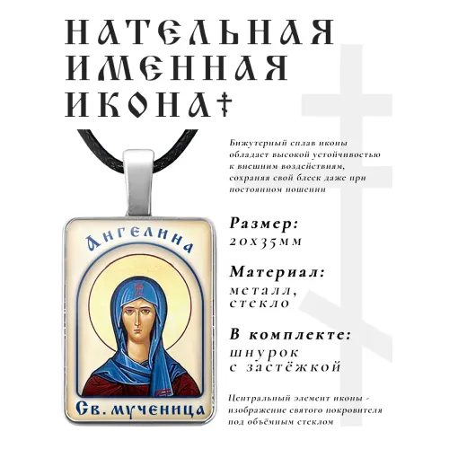 Нательная иконка "Ангелина" — это уникальный аксессуар, который сочетает в себе красоту и символику. Изготовленная из бижутерного сплава, она украшена объёмной стеклянной линзой, что придаёт изделию особый шарм. Иконка имеет размеры 20х35 мм и поставляется в комплекте с шнурком с застёжкой для удобства ношения. Упаковка выполнена в виде прозрачного пакетика, что делает её отличным вариантом для подарка или сувенира. Традиционно такие изделия ценятся за свою духовную значимость и могут стать прекрасным оберегом.