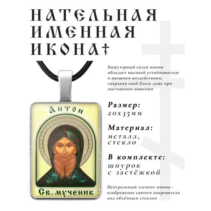 Нательная иконка с именем Антон — это уникальный сувенир, который сочетает в себе духовное значение и стильный дизайн. Изготовленная из бижутерного сплава, она украшена объёмной стеклянной линзой, что придаёт изделию особую выразительность.