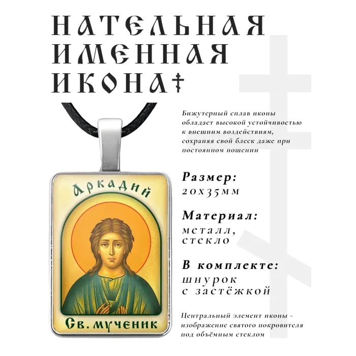 Именная иконка Аркадий — нательный аксессуар из бижутерного сплава с объёмной стеклянной линзой.