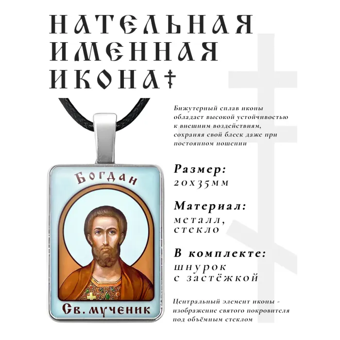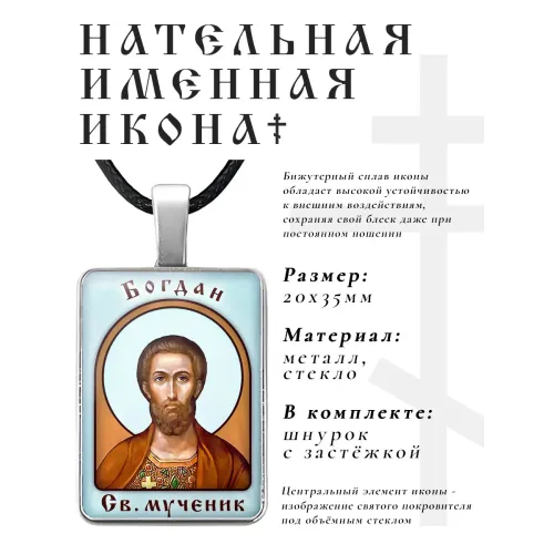 Именная иконка Богдан — сувенир из бижутерного сплава с объёмной стеклянной линзой.