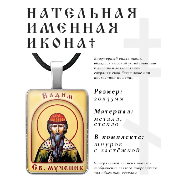 Нательная иконка из бижутерного сплава с объёмной стеклянной линзой.