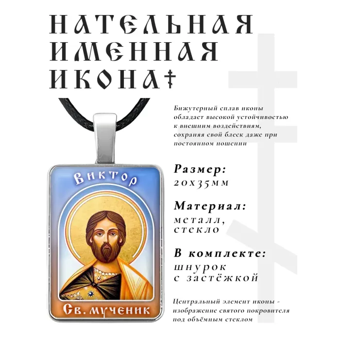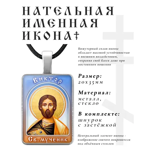 Именная иконка Виктор — это изысканный аксессуар, который сочетает в себе духовную символику и стильный дизайн. Нательная иконка выполнена из бижутерного сплава, что придаёт ей прочность и долговечность. Объёмная стеклянная линза защищает изображение, позволяя ему сиять даже в самых неприметных условиях. В комплекте предусмотрен шнурок с застёжкой для удобства ношения. Размеры изделия составляют 20х35 мм, что делает его компактным и легким для повседневного использования. Упаковка в прозрачный пакетик обеспечивает аккуратное хранение.