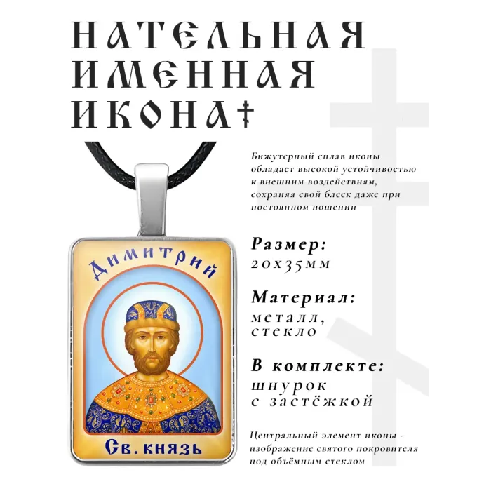 Именная иконка Димитрий — это стильный аксессуар, который сочетает в себе духовное значение и современный дизайн. Изготовленная из бижутерного сплава, она украшена объёмной стеклянной линзой, что придаёт изделию уникальный вид. В комплект входит шнурок с застёжкой, позволяющий удобно носить иконку на груди или в качестве подвески. Размеры 20х35 мм делают её компактной и лёгкой для повседневного использования. Упакована в прозрачный пакетик, что делает её отличным вариантом для подарка или личного использования.