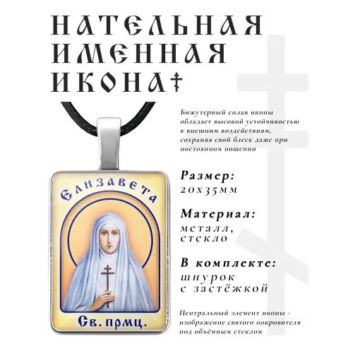 Именная иконка Елизавета — сувенир из бижутерного сплава с объёмной стеклянной линзой.