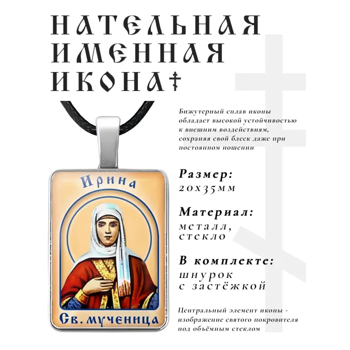 Именная иконка Ирина — сувенир из бижутерного сплава с объёмной стеклянной линзой.
