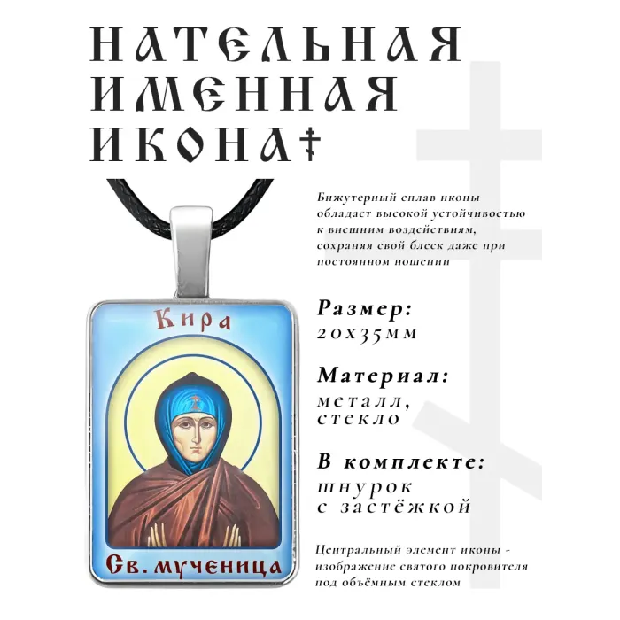 Именная иконка Кира — нательный аксессуар из бижутерного сплава с объёмной стеклянной линзой.