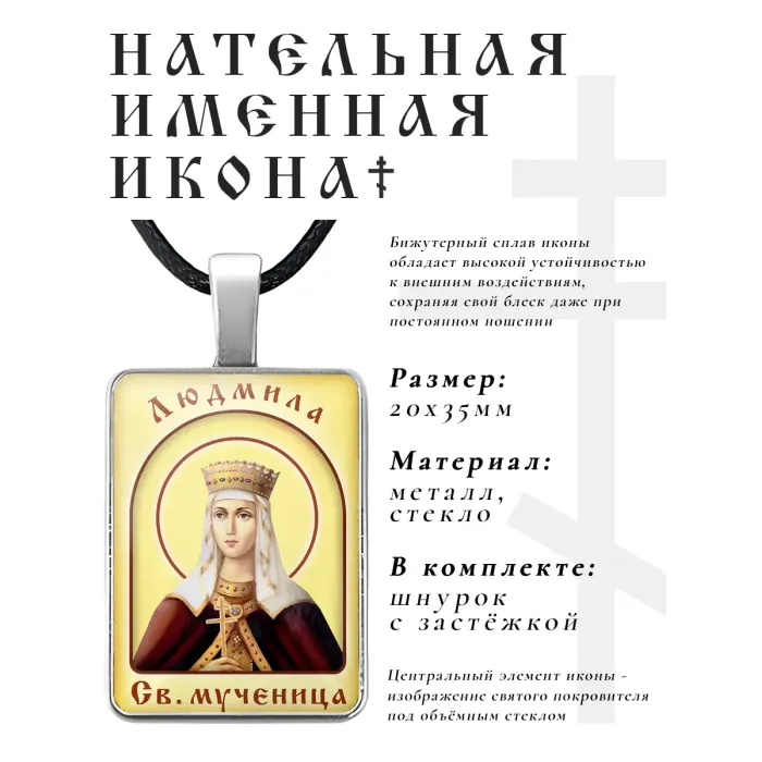 Нательная иконка с именем Людмила из бижутерного сплава с объёмной стеклянной линзой.