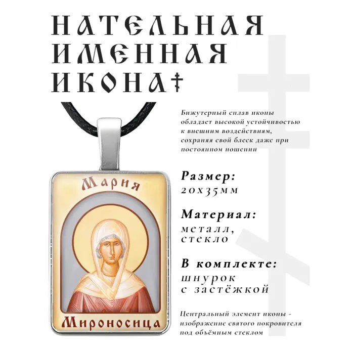 Именная иконка «Мария» — нательный аксессуар из бижутерного сплава с объёмной стеклянной линзой.