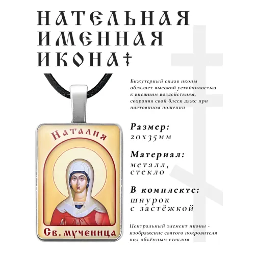 Именная иконка Наталия (Наталья) — нательное украшение из бижутерного сплава с объёмной стеклянной линзой.