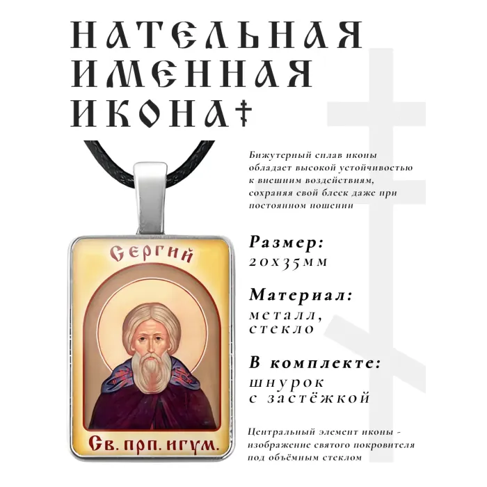 Именная иконка Сергий — сувенир из бижутерного сплава с объёмной стеклянной линзой.