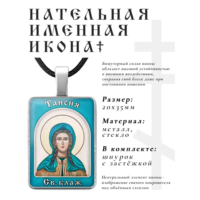 Именная иконка Таисия — нательный аксессуар из бижутерного сплава с объёмной стеклянной линзой.