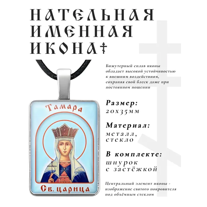 Нательная иконка из бижутерного сплава с объёмной стеклянной линзой.