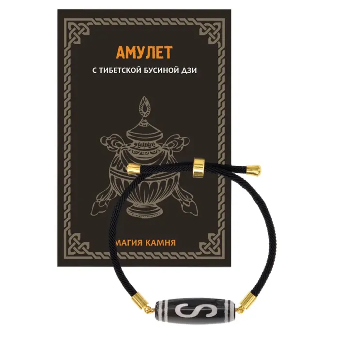 Браслет с тибетской бусиной Дзи «Денежный крючок» на черном шнуре. Изготовлен вручную из натурального агата.