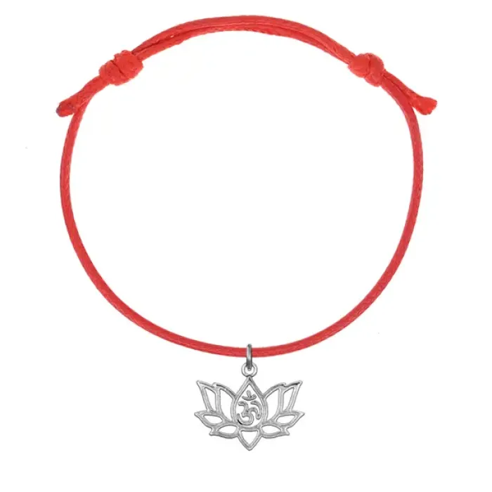 Браслет-амулет из красного вощёного шнура с подвеской в виде символов Лотос и Ом.