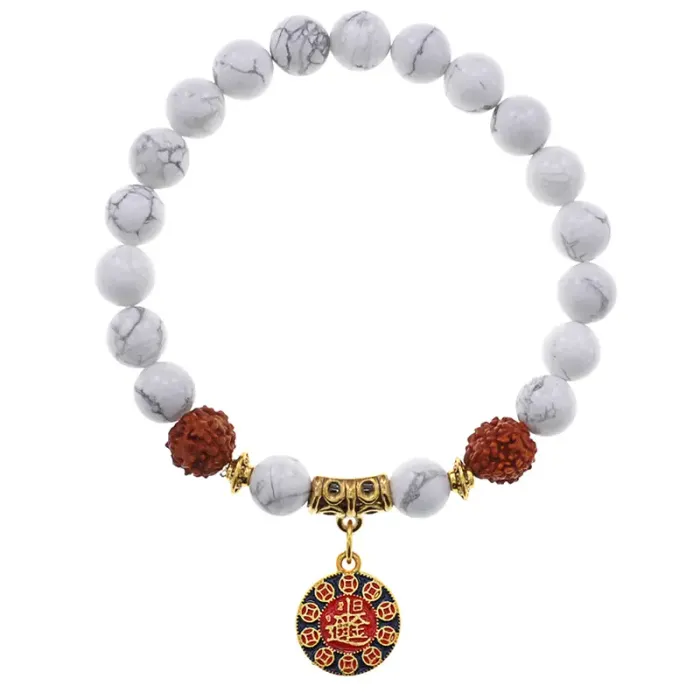Стрейч-браслет из натурального камня кахолонг с бусинами рудракши и металлической подвеской.