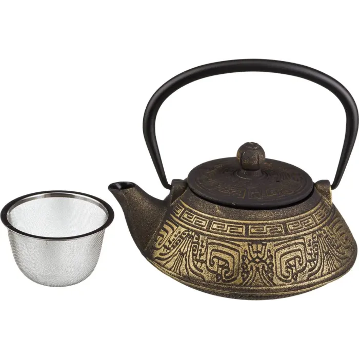 Корпус чайника изготовлен из чугуна, который обеспечивает равномерное распределение тепла и длительное его сохранение. Внутренняя поверхность покрыта эмалью, что защищает материал от коррозии и упрощает уход. Конструкция включает съёмный сетчатый фильтр, который удерживает чаинки, обеспечивая чистоту напитка.