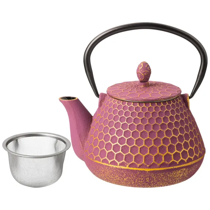Корпус чайника изготовлен из чугуна, который долго сохраняет тепло. Внутренняя поверхность покрыта эмалью, что обеспечивает гигиеничность и устойчивость к окрашиванию. Конструкция оснащена сетчатым фильтром для удержания чаинок.