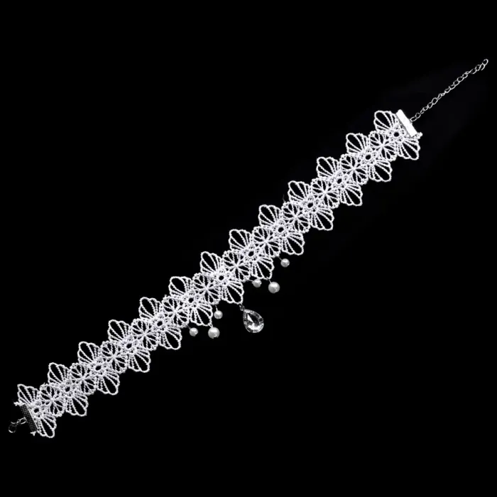 Кружевной чокер белого цвета для ношения на шее. Изготовлен из текстиля и бижутерного сплава с декоративными вставками.
