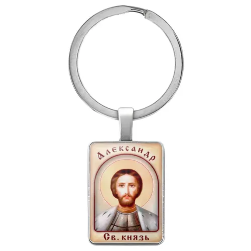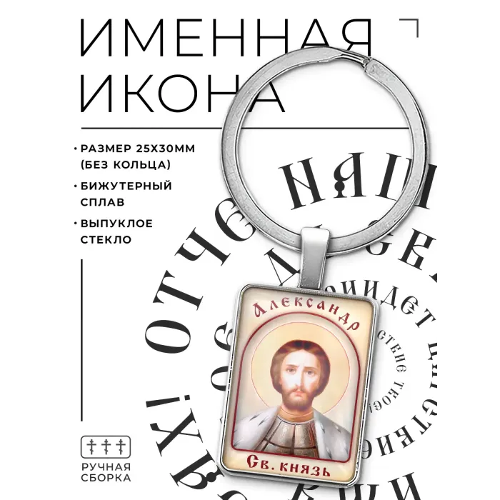 Именная иконка-брелок с изображением святого покровителя. Изделие выполнено из бижутерного сплава и стекла, имеет объёмную стеклянную линзу и кольцо для ключей.