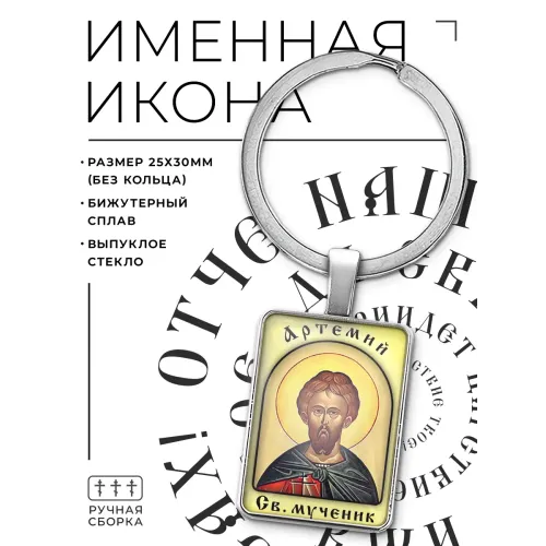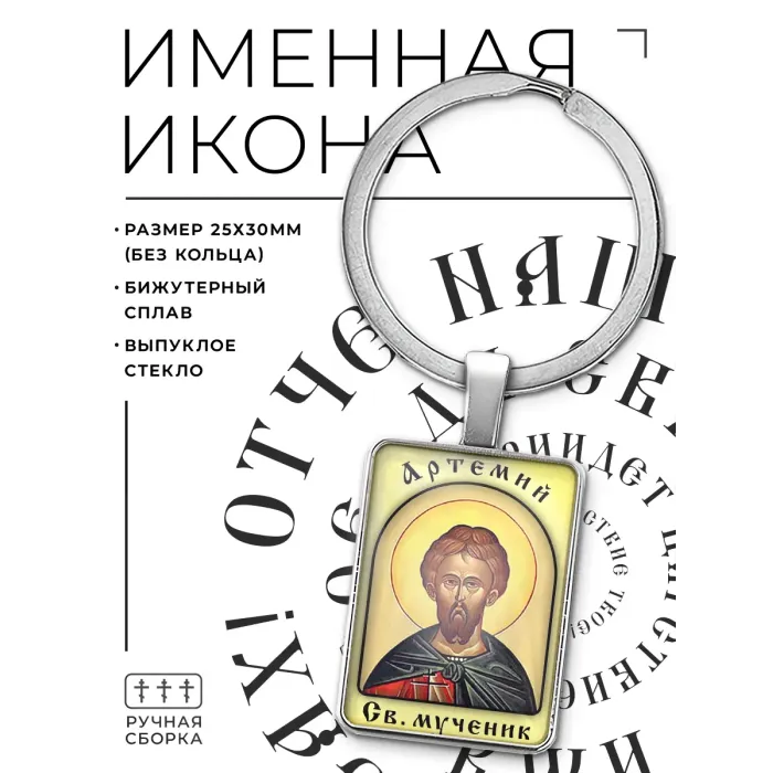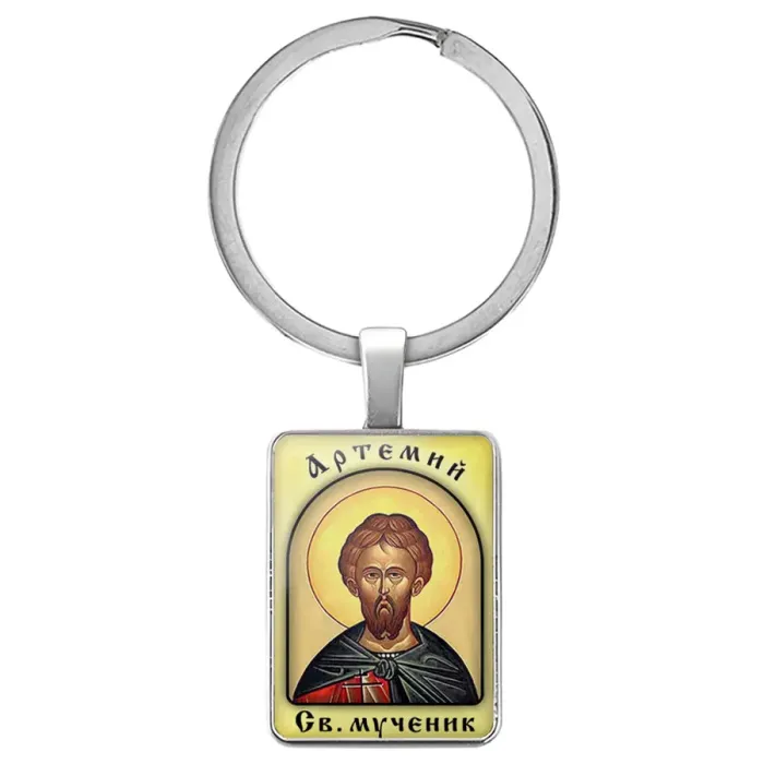 Именная иконка-брелок Артемий (Артем) — металлический сувенирный аксессуар с изображением святого под объемной стеклянной линзой.